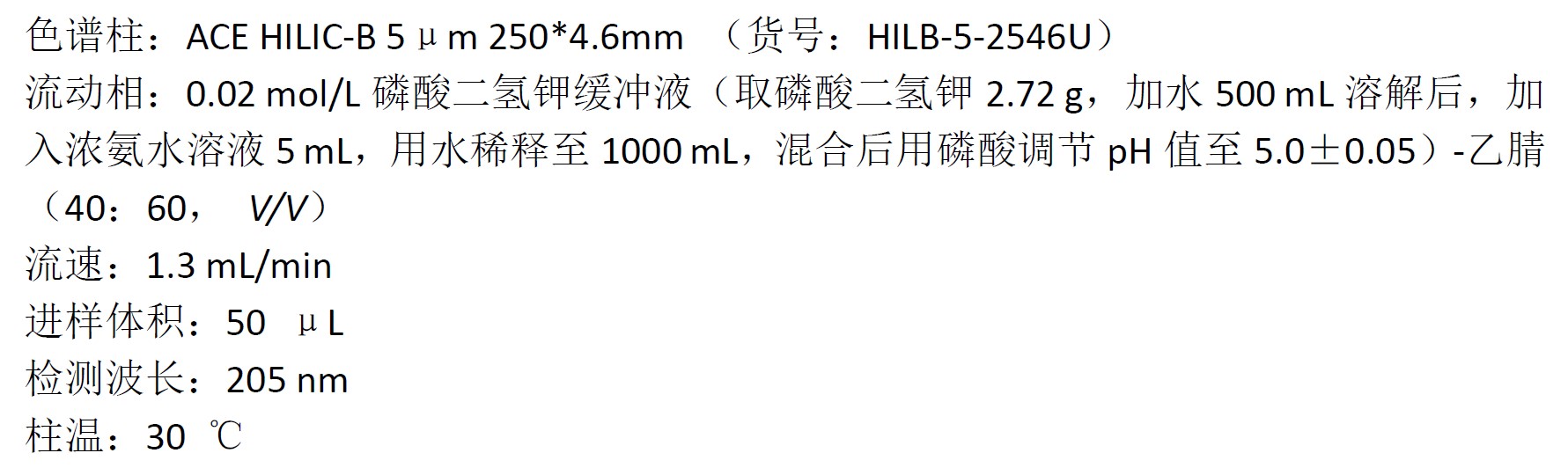 可以選用帶有HILIC作用的色譜柱實(shí)現(xiàn)保留,當(dāng)使用磷酸鹽類時(shí),可以在截止波長條件下用UV檢測,比較經(jīng)典的應(yīng)用是用ACE HILIC-B檢測門鳥氨酸: