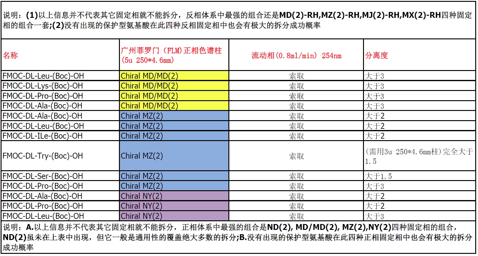 當(dāng)氨基酸上的氨基和羧基用Boc和/或FMOC等保護(hù)起來時(shí),可以用正相或者反相的多糖類手性柱實(shí)現(xiàn)非常好的分離,有現(xiàn)成的分析方法,可以極大地減少方法開發(fā)的時(shí)間。