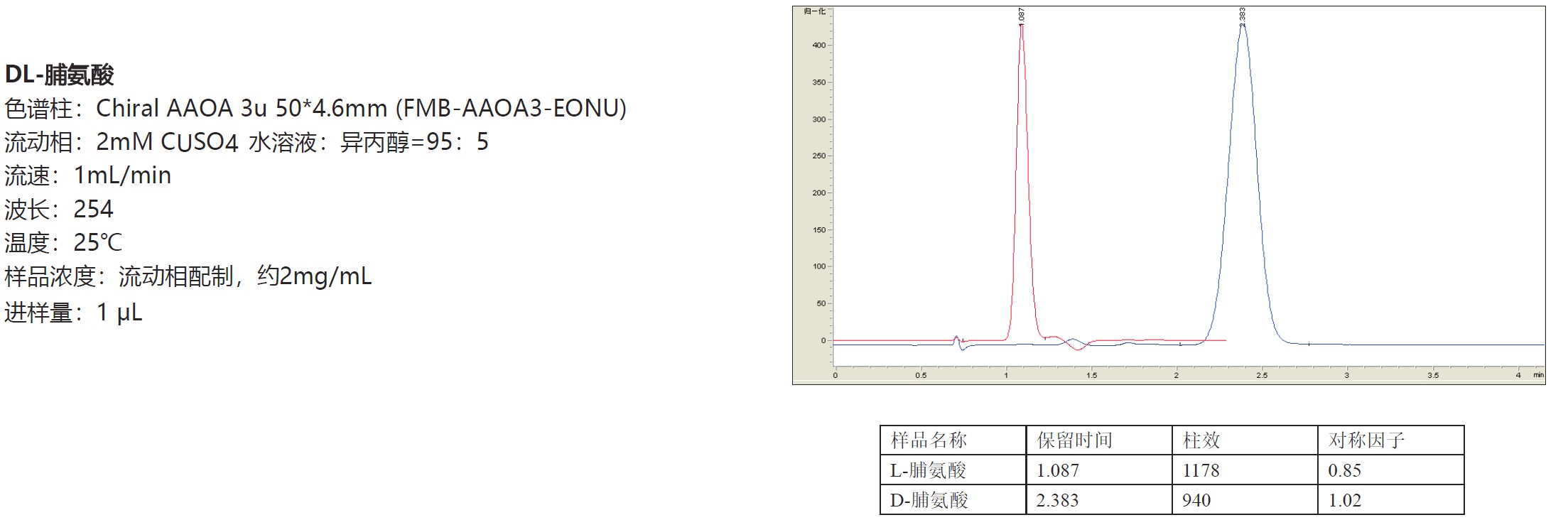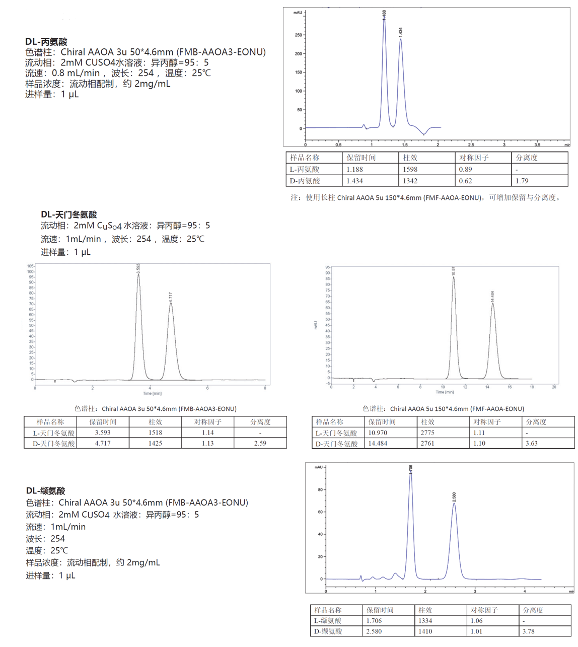 對于非保護(hù)的氨基酸,菲羅門推出AAOA分析柱,即通過鍵合D-青霉胺于十八烷基柱上而成的配體交換型手性柱。該手性柱手性柱可以用于拆分α-型有機(jī)酸、α-型非衍生氨基酸及其衍生物、二元胺、二肽、內(nèi)酰胺和氨基醇等。