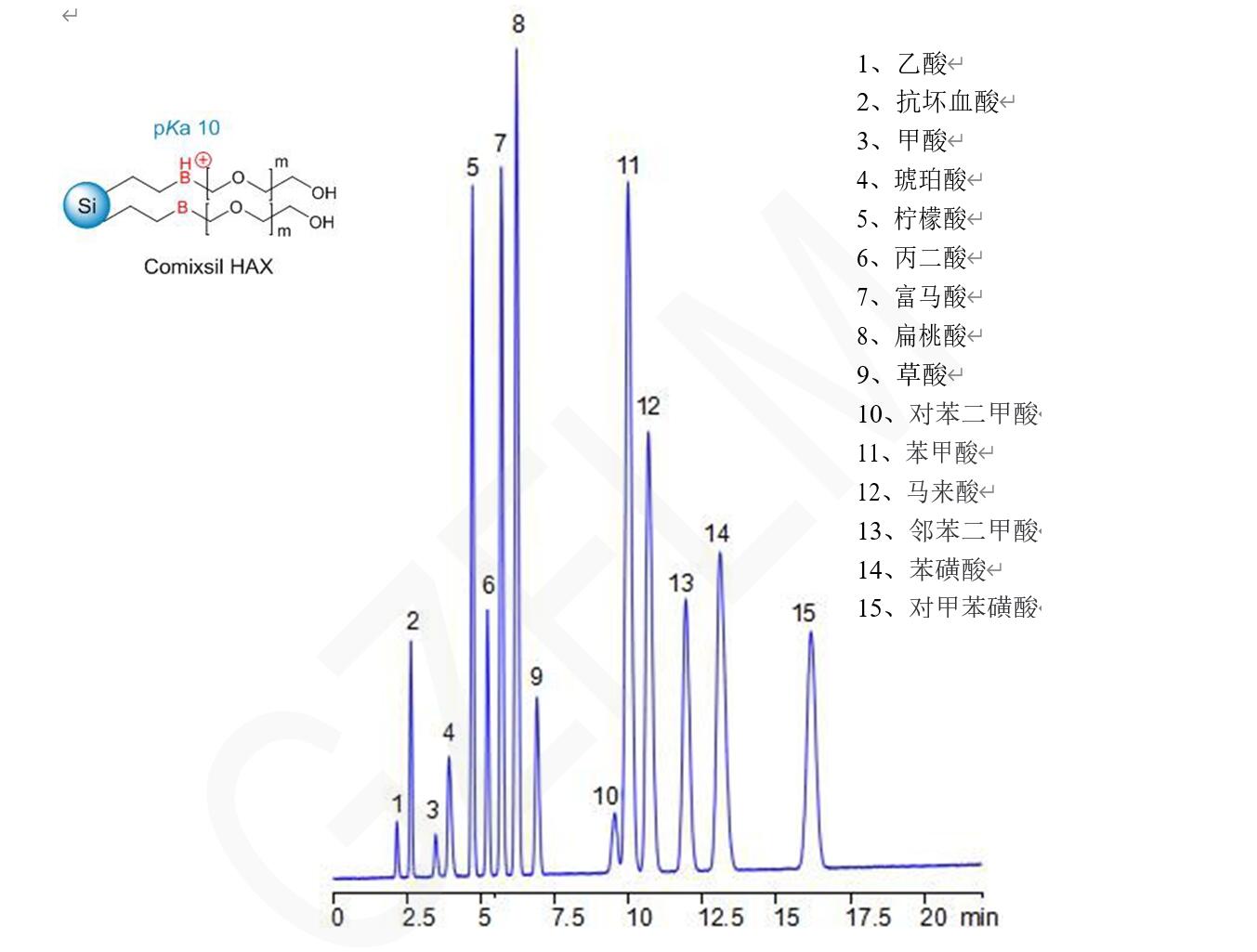 15種有機酸分析HPLC色譜柱方法說明:調節流動相的 pH 值可以有效增強或者抑制分析物以及 Comix 系列色譜柱上的基團的離子化,從而可以幫助我們更好地分離離子性和疏水性存在差異的有機酸。當從高 pH (pH 4)梯度變化到低 pH (pH 2)時,有機酸的電離逐漸被抑制,因此這些有機酸與 Comixsil HAX 上的固定相上的陽離子的交換也會逐漸減弱。由于這款色譜柱兼容 100%的水和 100%的乙腈,因此我們可以嘗試使用單、雙或者三梯度來獲得好的分離度和峰形。