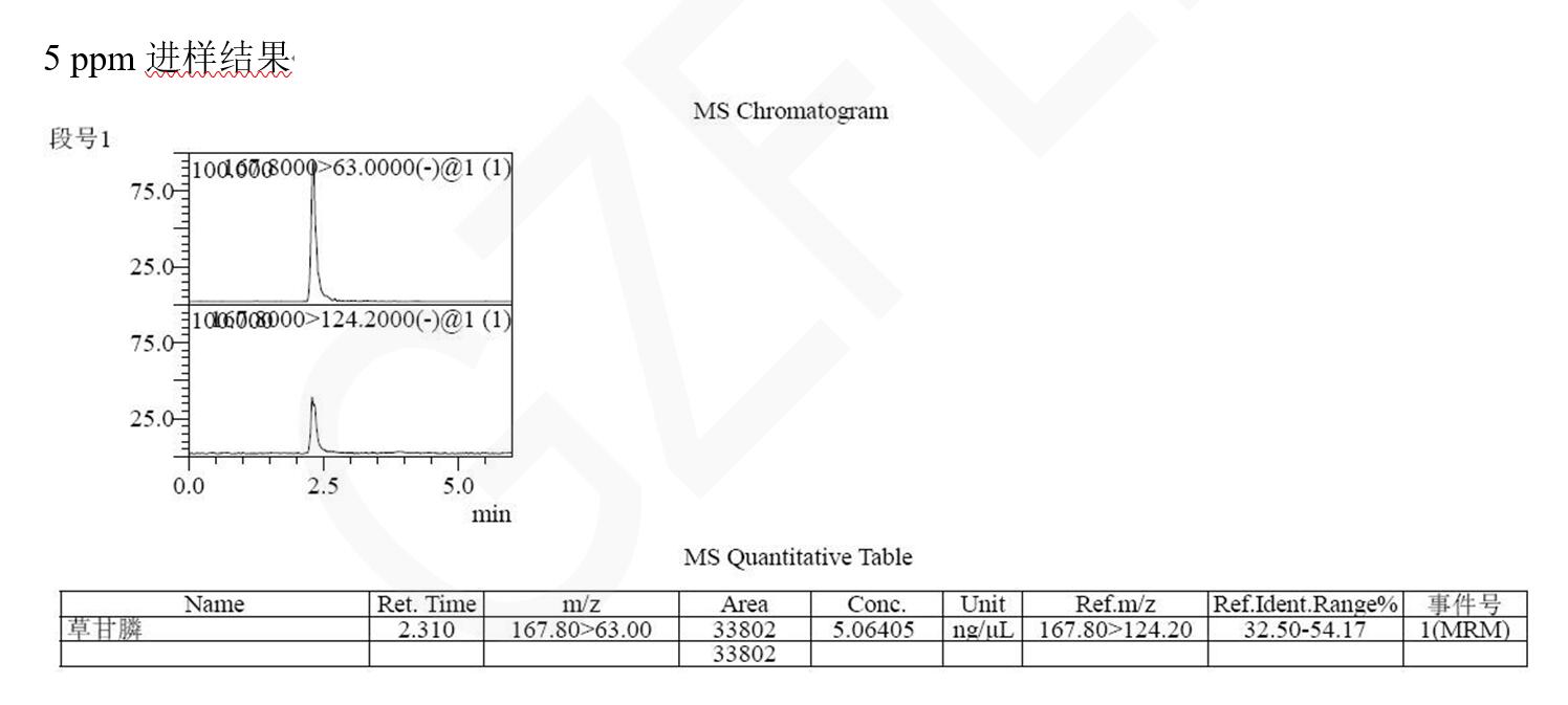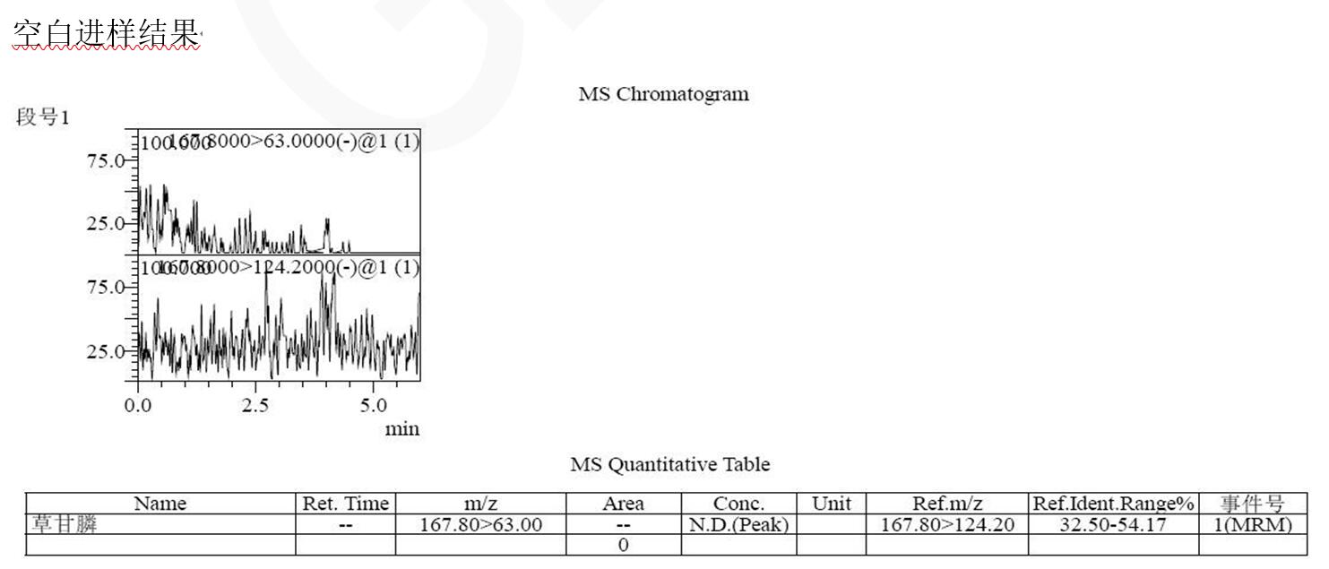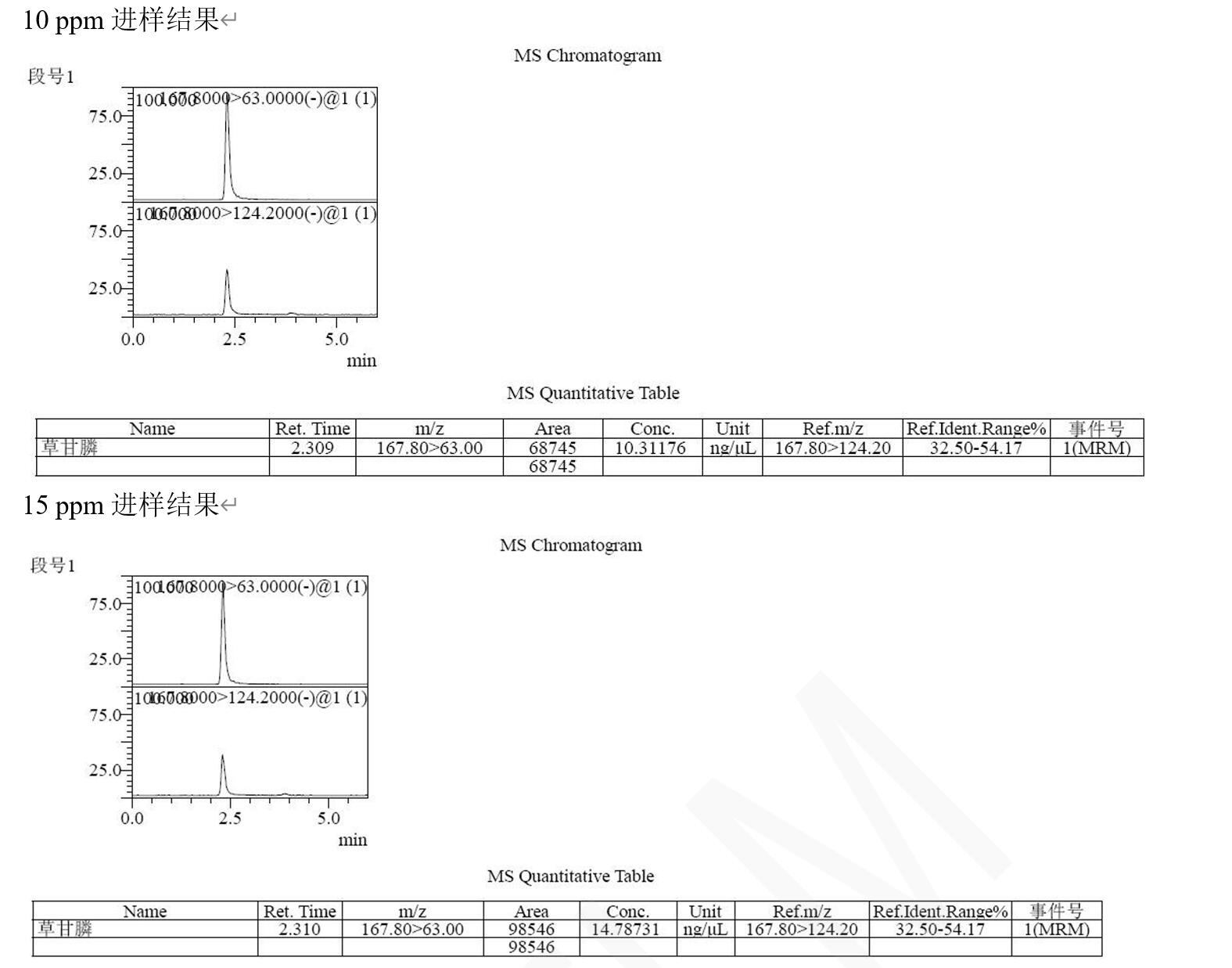 說明:本方法研究草甘膦不衍生直接檢測。相比于傳統衍生后用 C18 分析,或者用氨基柱不衍生 PH=10-11 條件下分析,帶來的復雜,耗時,以及氨基柱結果重現與壽命上的問題。此方法簡單,快速,方便。可滿足常規分析檢測需求以及多數殘留檢測需求。