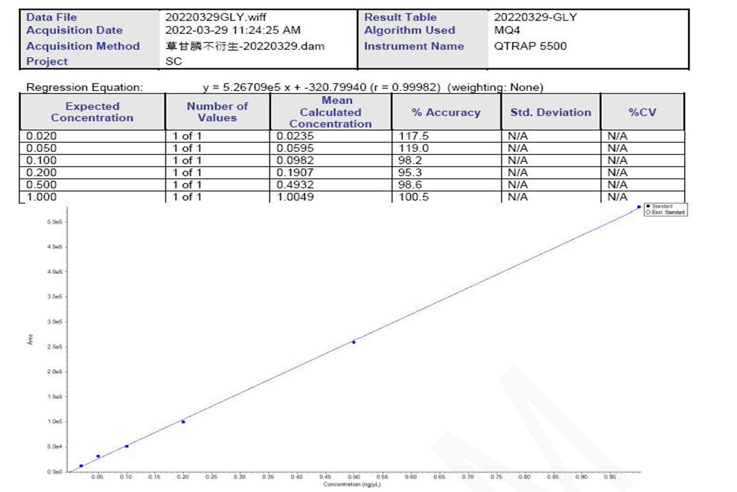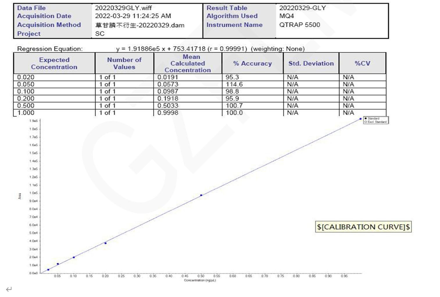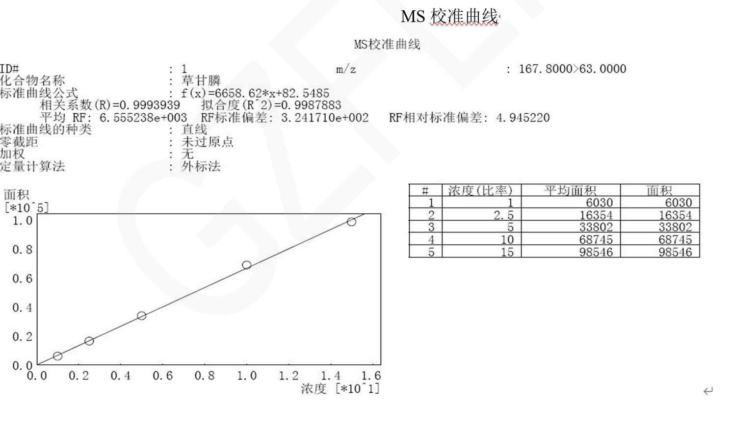 說明:本方法研究草甘膦不衍生直接檢測。相比于傳統衍生后用 C18 分析,或者用氨基柱不衍生 PH=10-11 條件下分析,帶來的復雜,耗時,以及氨基柱結果重現與壽命上的問題。此方法簡單,快速,方便。可滿足常規分析檢測需求以及多數殘留檢測需求。