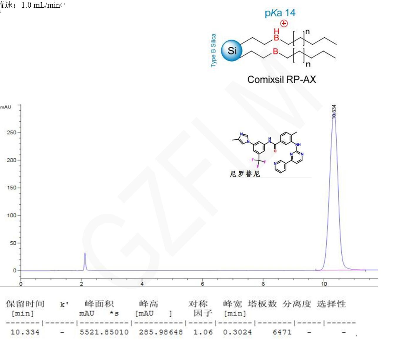 方法說明:尼羅替尼具有多個堿性基團,在 C18 柱上會出現(xiàn)明顯拖尾效應;而使用 Comixsil RP-AX 是陰離子交換+疏水混合模式,對化合物上堿性基團是排斥作用,可以達到改善峰型的效果。