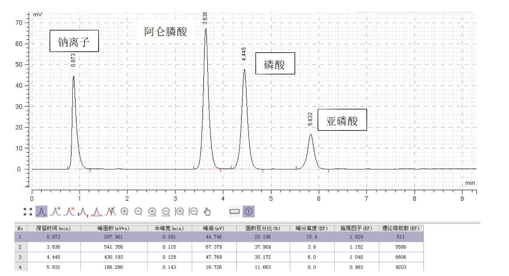 方法說明:使用 Comixsil HAX HILIC 模式+陰離子交換混合模式色譜柱,可以很好的分離阿侖膦酸、磷酸及亞磷酸,配制的濃度約為 0.1mg~0.2mg/ml,對于保留時間的調整,可通過調整梯度洗脫進行改善.