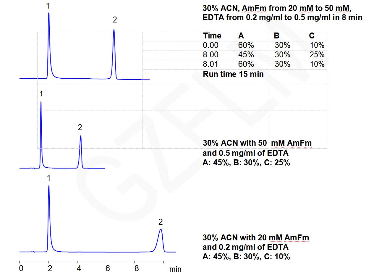 30% ACN, AmFm from 20 mM to 50 mM, EDTA from 0.2 mg/ml to 0.5 mg/ml in 8 min