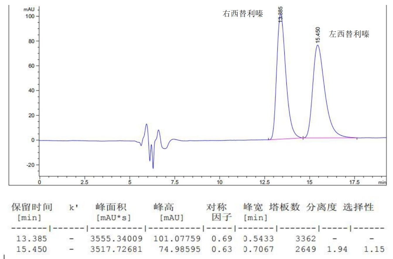 方法說(shuō)明:根據(jù)標(biāo)準(zhǔn)要求,出峰順序依次為右西替利嗪與左西替利嗪,左西替利嗪拖尾因子不大于 2.0,右西替利嗪與左西替利嗪分離度應(yīng)大于 1.4,使用 Chiral NS(2)-RH 進(jìn)行分析可滿(mǎn)足標(biāo)準(zhǔn)要求。
