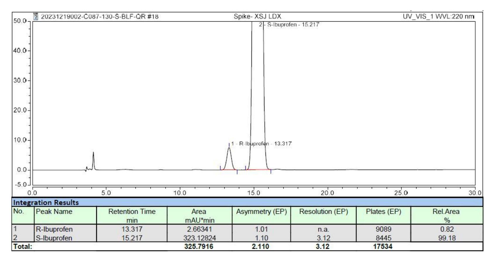 評(píng)語:該款反相手性色譜柱相比藥典的正相方法,采用簡(jiǎn)單的反相流動(dòng)相體系,更為實(shí)用方便。峰形對(duì)稱, 柱效高。藥典要求理論板數(shù)按右布洛芬峰計(jì)算不低于 2000,右布洛芬峰與左布洛芬峰之間的分離度應(yīng)大于