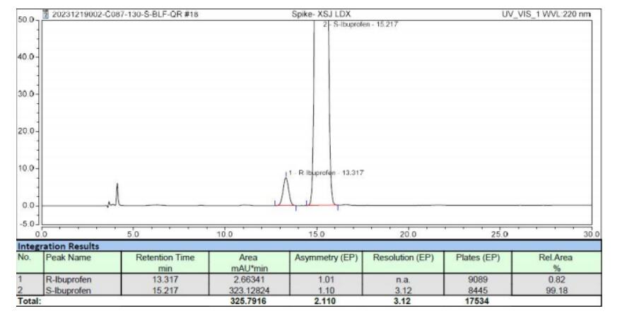 方法說明:該款反相手性色譜柱相比其它的正相方法,采用簡單的反相流動相體系,更為實用方便。峰形對稱,柱效高。藥典要求理論板數按右布洛芬峰計算不低于 2000,右布洛芬峰與左布洛芬峰之間的分離度應大于3.0,此反相方法也完全符合藥典的指標要求。