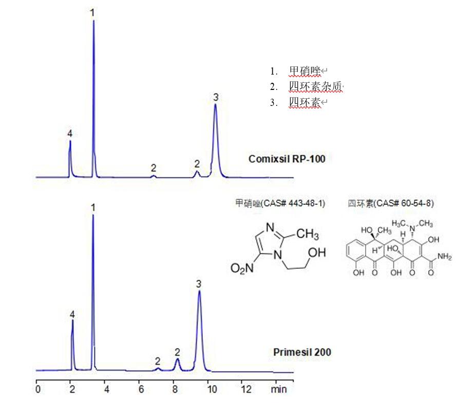 App ID: FLM-C250006 Comixsil RP-100 與 Primesil 200 分析甲硝唑與四環(huán)素 色譜柱:Comixsil RP-100 與 Primesil 200 規(guī)格:3μm 150×4.6 mm 流動相:乙腈:水:200mM 磷酸氫二銨(pH2.0 ) = 20:40:40 流速:1 mL/min 檢測波長:220nm 柱溫:25℃ 色譜圖: