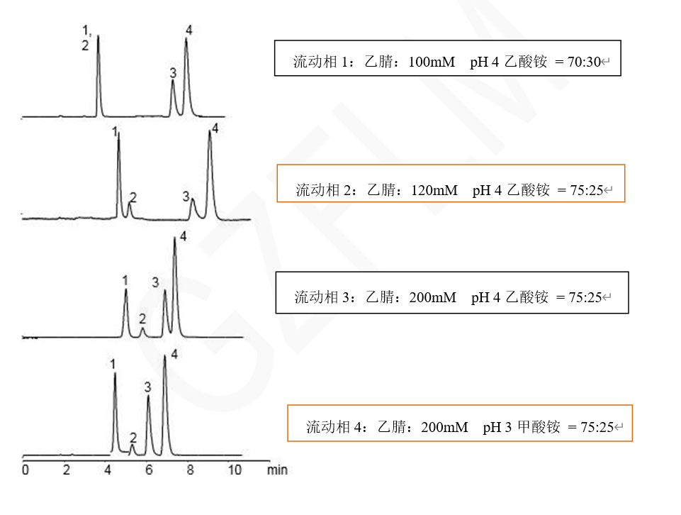 說明:本案例中乙腈比例及緩沖鹽種類和強度的變化帶來磷霉素與庶糖的0分離到完全分離的變化, 以及保留時間上的變化。類似的雜質也可通過此類調整或者梯度調整條件,實現(xiàn)分離。 在液相中同時分析磷霉素、蔗糖、氨丁三醇及鈉離子是一個復雜的過程,因為這四種物質在化學性質、極性和保留行為上可能存在顯著差異。以下是一種可能的分析策略: