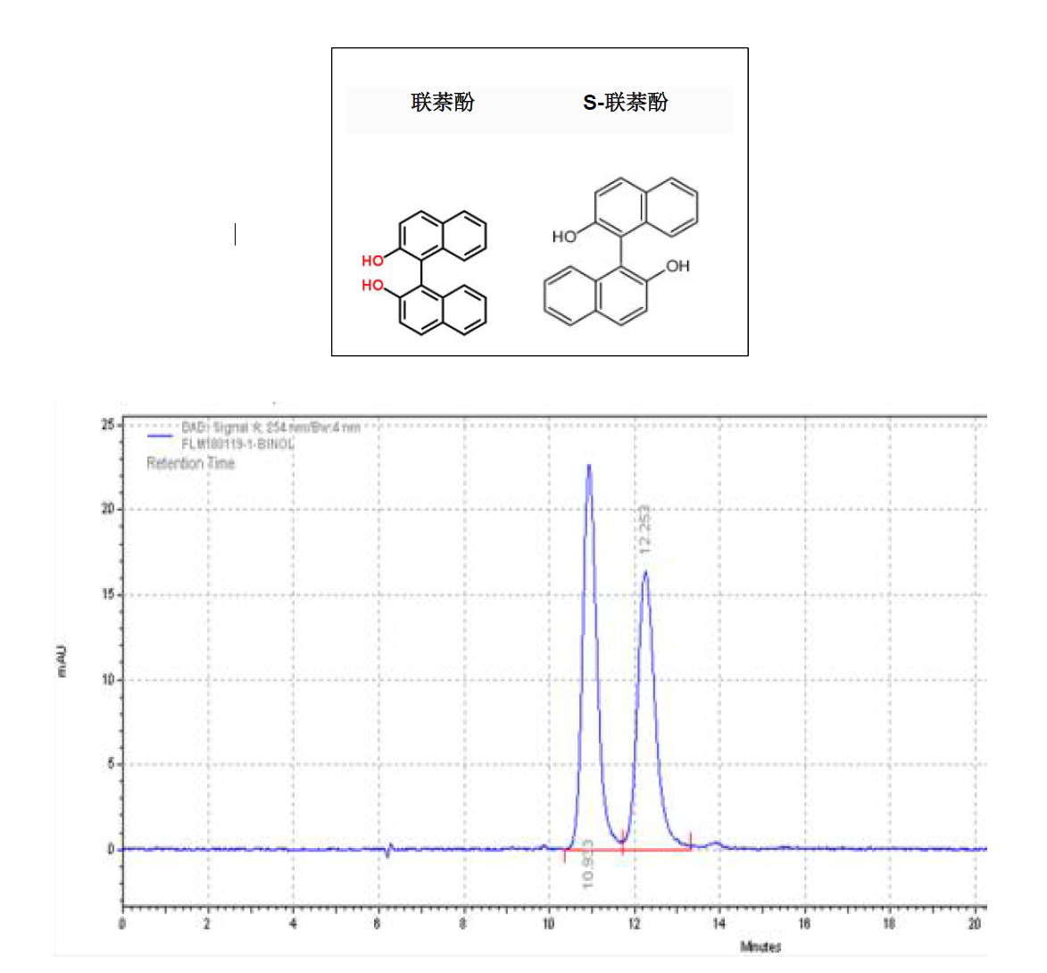聯萘酚(1,1'-聯-2-萘酚,BINOL)是一種具有手性軸的不對稱聯芳香族化合物,存在兩個對映異構體,即(R)-BINOL和(S)-BINOL,因此其手性分離具有重要意義。 - 通過使用手性拆分劑與聯萘酚形成非對映異構體鹽,然后利用這些鹽在溶劑中的溶解度差異進行分離。拆分劑的選擇對于分離效率和產物純度至關重要。例如,可以使用氯化(1S,2S)-1,3-二羥基-1-(對硝基苯基)-2-(N-芐基-N,N-二甲基)丙銨鹽作為拆分劑,通過特定的反應條件實現聯萘酚的定量化手性分離。 - 另一種化學拆分方法是使用光學活性的拆分劑(如(+)-脫氫樅胺)與聯萘酚反應生成非對映異構體鹽,然后進行分離和純化。這種方法同樣具有拆分效率高、操作簡單、成本低廉等優點。