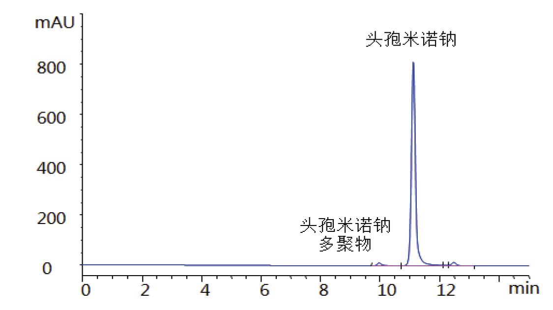 樣品:1 mg/mL 頭孢米諾鈉(0.1 M NaOH 破壞)