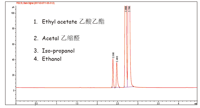 結(jié)論:白酒中一項(xiàng)主要考察指標(biāo),乙酸乙酯與乙縮醛在 FB-Wine 氣相柱上可以很容易在 50 ℃左右達(dá)到基線分離.
