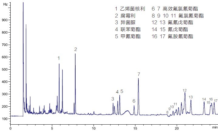 圖 1 添加水平為 0.25 mg/kg 普洱中有機氯和擬除蟲菊酯類農藥多殘留檢測色譜圖