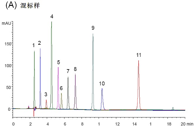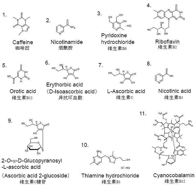 進樣體積:4μL(標品濃度為 50μg/mL;能量飲品用乙腈/水(80/20)稀釋 10 倍)