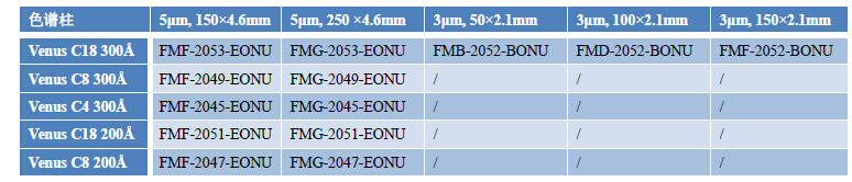 Venus 系列反相色譜柱以超純硅膠為基質,采用特殊的化學鍵合技術,形成單層ODS,使