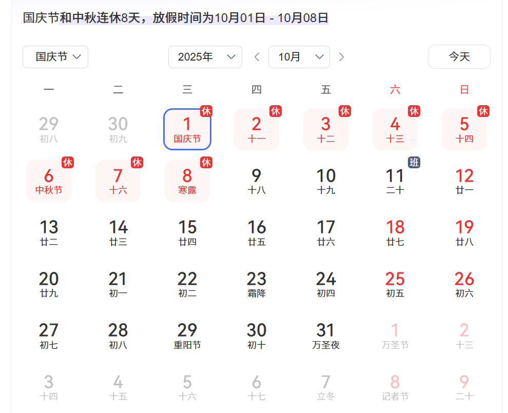 國慶節(jié)、中秋節(jié):10月1日(周三)至8日(周三)放假調(diào)休,共8天。 9月28日(周日)、10月11日(周六)上班。