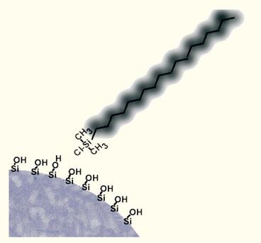 如圖所示,有機氯硅烷與大多數硅烷醇基反應,但仍有部分不反應,這會在硅膠表面形成一層較厚的碳氫化合物層。