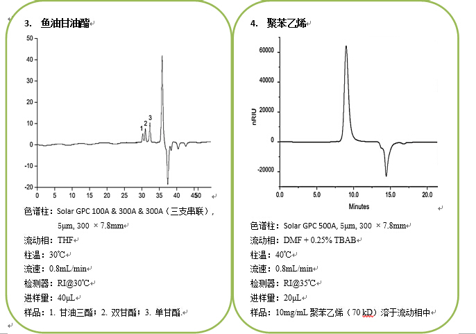 Solar系列體積排阻色譜柱,以高交聯度的聚苯乙烯/二乙烯苯(PS/DVB)顆粒為基質,具有極窄的粒徑和孔徑分布,使分析中保留時間與分子量具有準確的線性關系。高交聯度的多孔顆粒具有優異的化學和物理穩定性,因此在更換有機溶劑時可以使分子量校正曲線的形狀和色譜柱的柱效幾乎保持不變。
